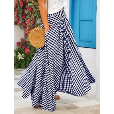 Women's elegant check pattern midi skirt, high waist slimming fullerene hem, 95% polyester 5% spandex lining