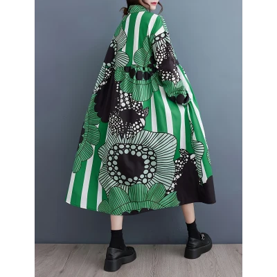 Japanese style print stitch fashion dress, turnover collar, long sleeves, loose fit - casual long tube dress, green and black geometric pattern, seasonless
