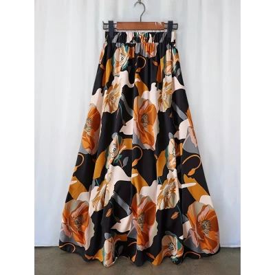 2025 New Arrivals Floral Print A-Line Midi Skirt for Women - High Waist Flared Beach Skirt with Pleated Hem, Black